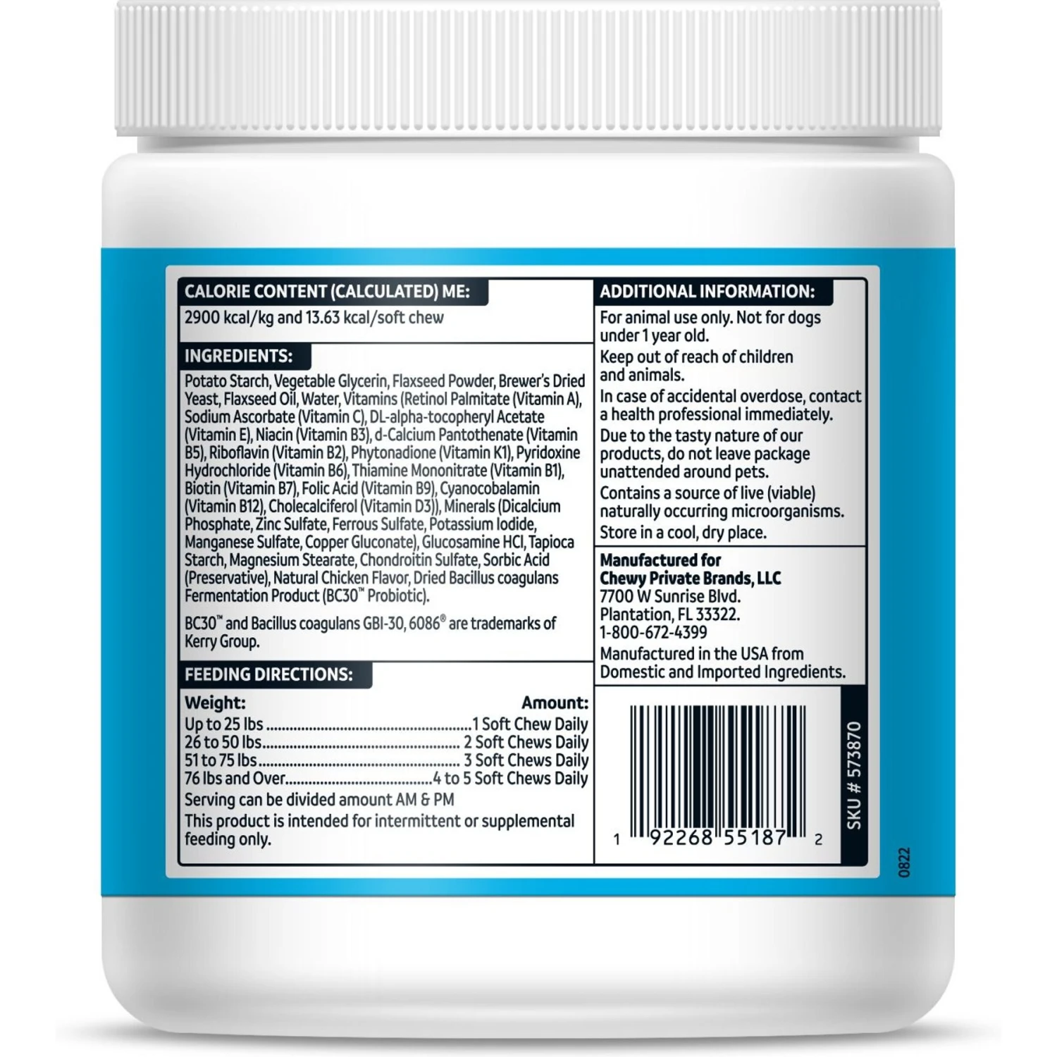 - Also contains BC30™ Probiotic to help maintain gut health, glucosamine and chondroitin to help support mobility, and omega fatty acids to backup that skin and coat health. This team was voted most likely to put the pep in your pup’s step!