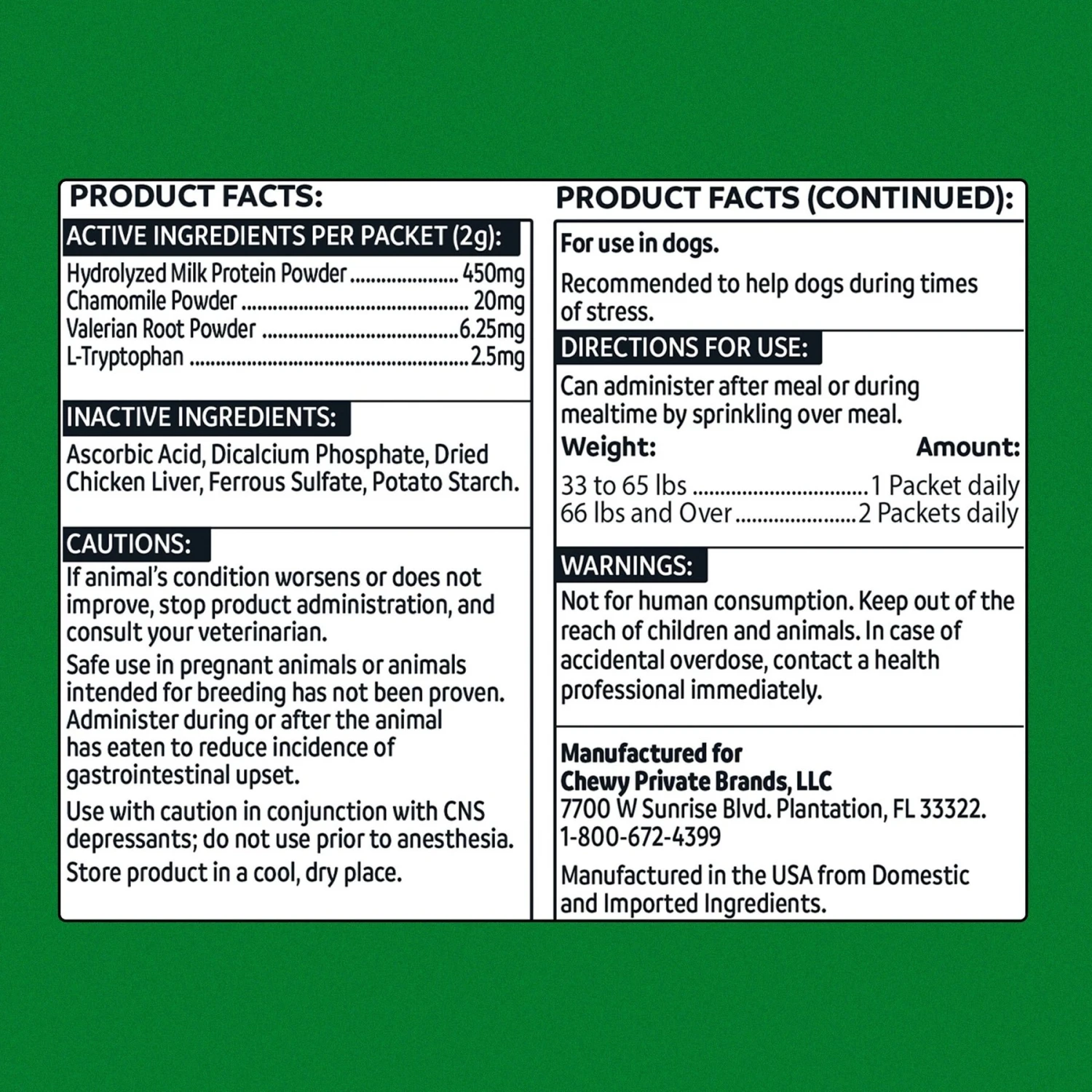 - Bring your pup all the chilled-out vibes with these ready-to-give powder packets formulated to support a sense of calm without making them drowsy. Perfect during travel, vet visits, meeting new people, fireworks displays, or any other times stress may pop up.