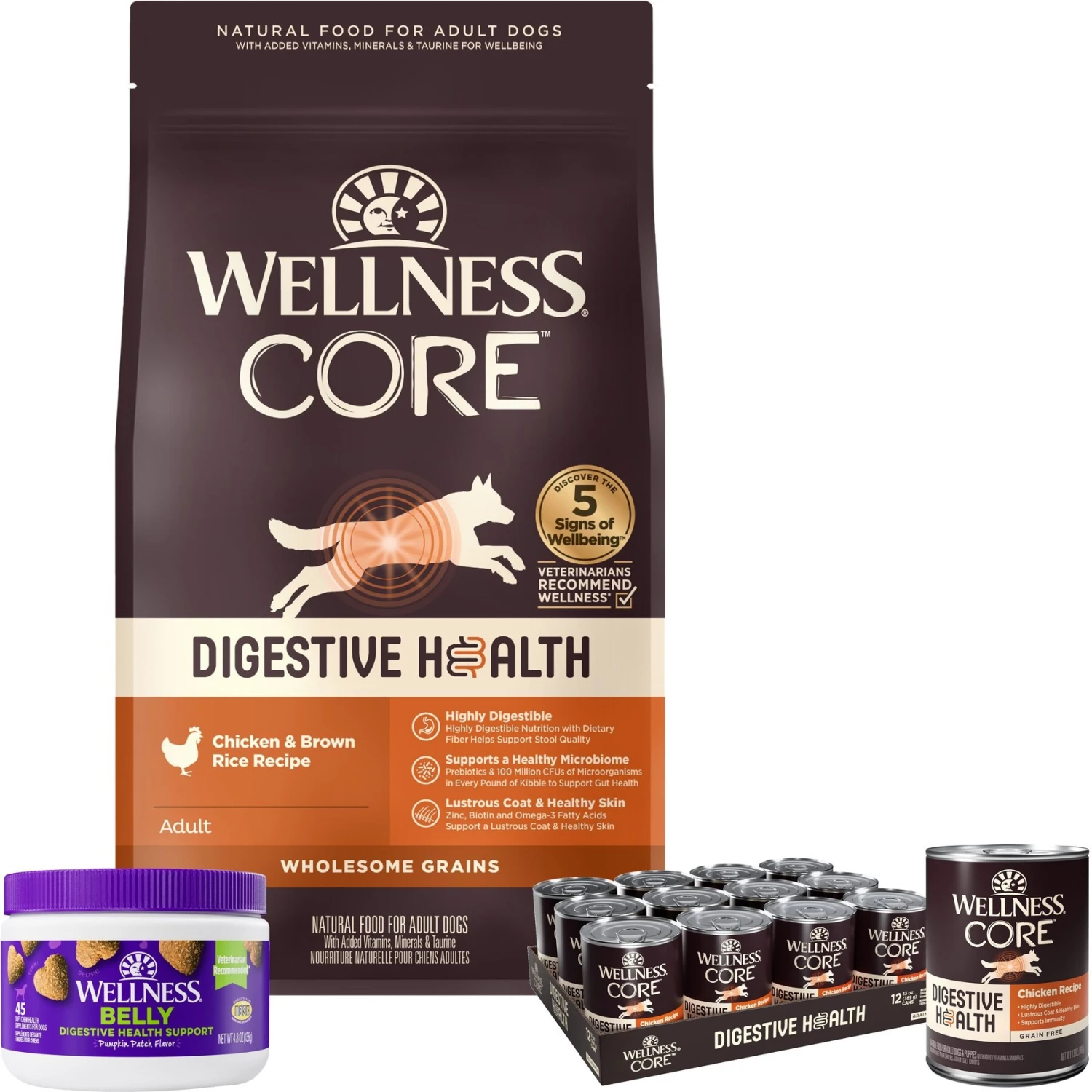 Wellness CORE Digestive Health Wholesome Grains Chicken & Brown Rice Recipe Dry Dog Food, 4-lb bag—Your dog’s best, healthy life begins at his gut. Support digestive health with Wellness CORE Digestive Health Wholesome Grains Chicken & Brown Rice Recipe Dry Dog Food. This dry dog food is made to be super digestible, coated with probiotics, a unique blend of prebiotic fibers and digestive enzymes. With irresistible chicken as the first ingredient––and other amazing ingredients like superfoods pumpkin and papaya, essential vitamins, omega-3 fatty acids––you can fill your dog’s bowl with gut-friendly goodness. It even supports a shiny coat and healthy skin. Great for adult dogs of all ages!