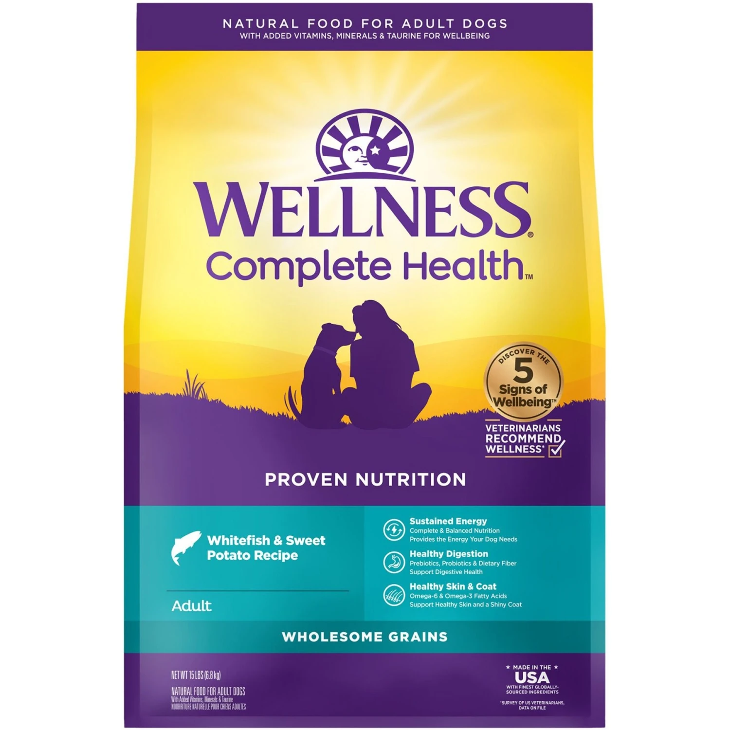 Wellness Shine Skin & Coat Bacon Flavor Chew Supplements For Dogs & Wellness Complete Health Adult Whitefish & Sweet Potato Recipe Dry Dog Food