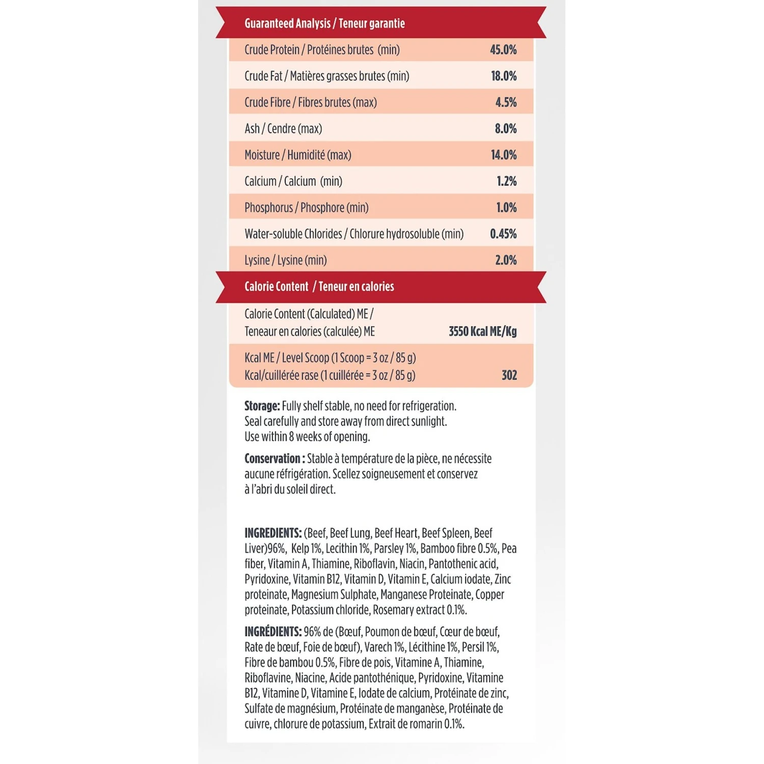 - High-protein low-fat formula is made with 96% beef and beef organ meat.