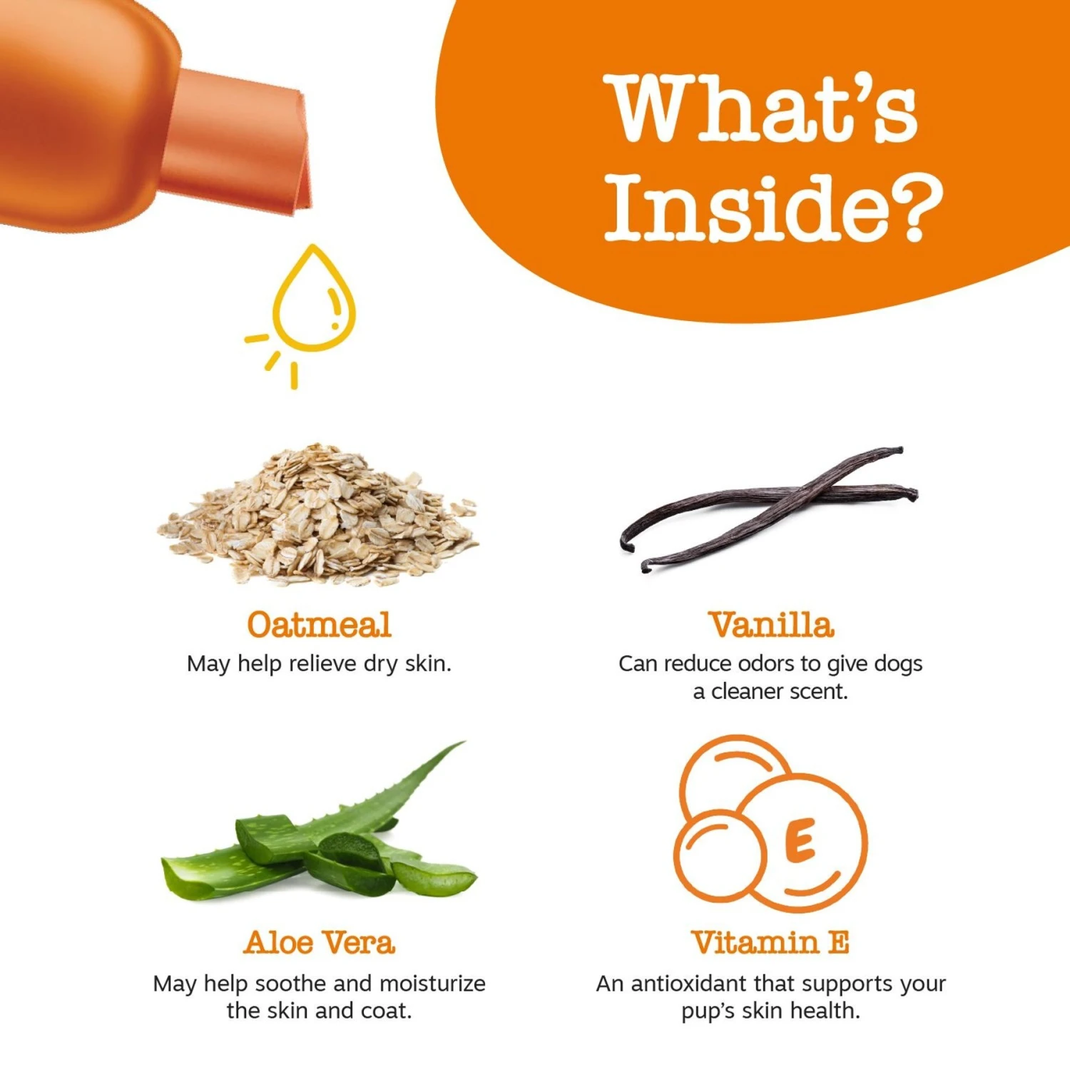 - This shampoo includes oatmeal to keep skin moisturized, plus the antioxidant Vitamin E to help support your pet’s healthy skin.