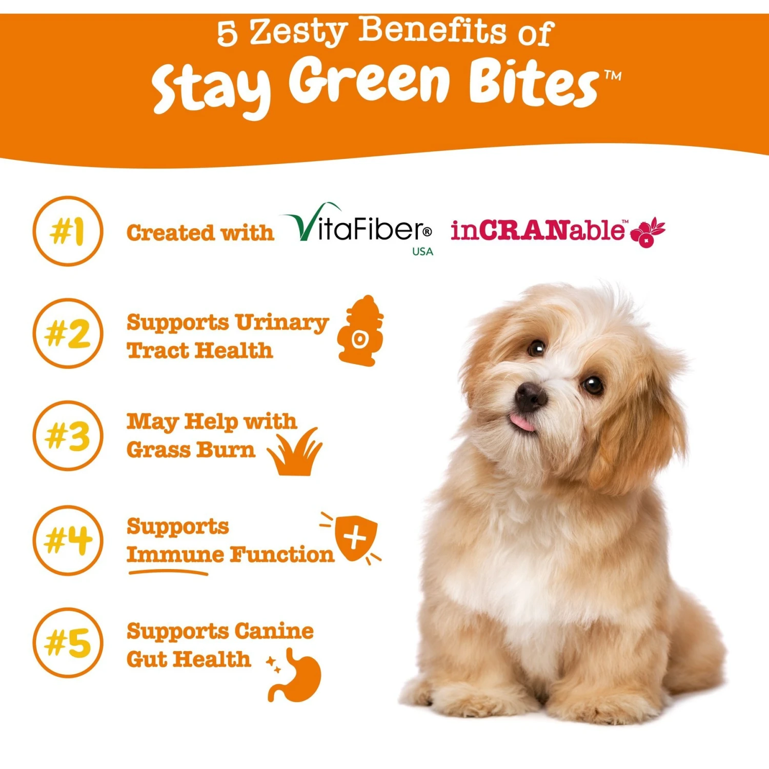 - Stay Green Bites are functional soft chew supplements that may help with grass burn from dog urine, while also providing digestive support.